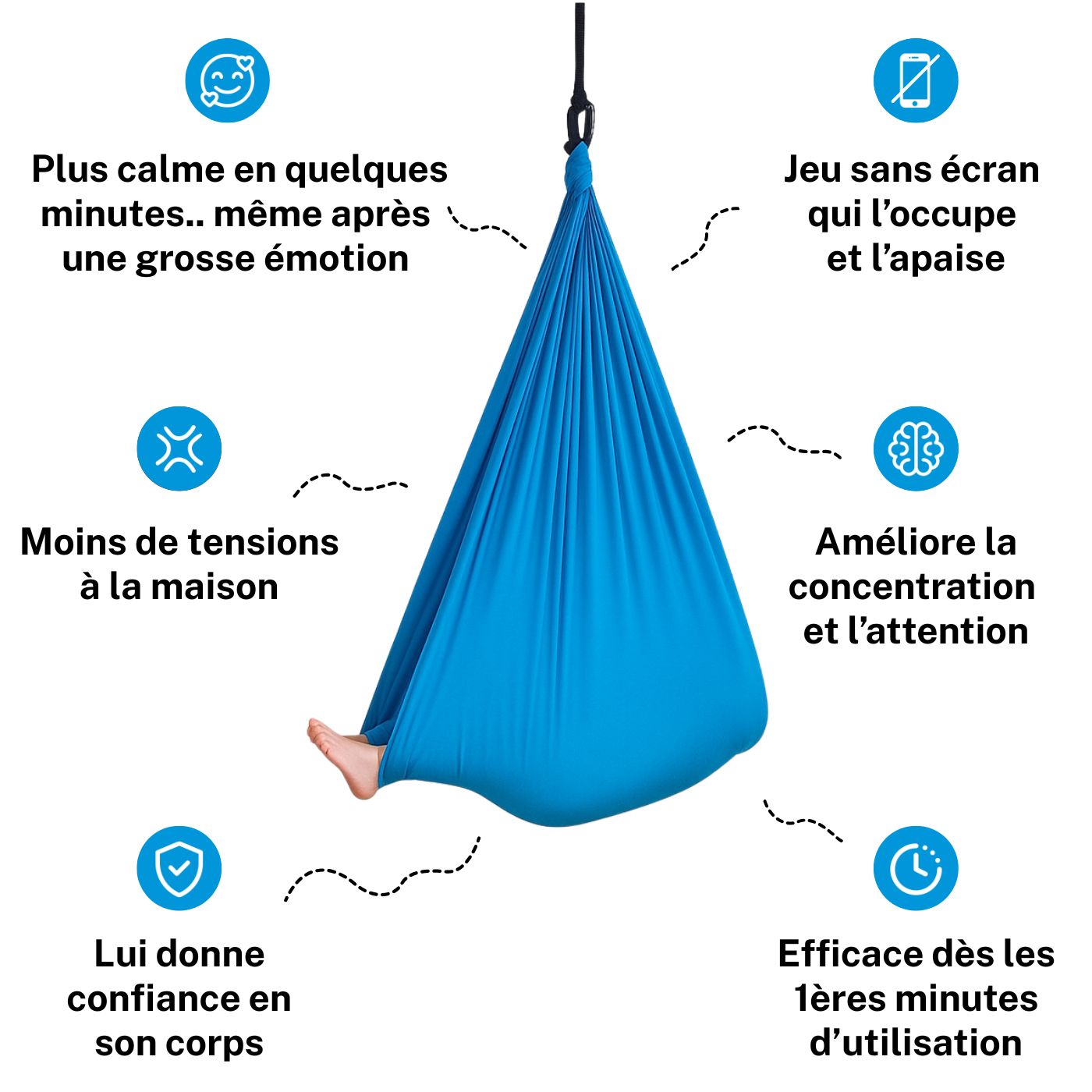 Le mouvement de balancement aide l’enfant à se recentrer, à libérer les tensions et à retrouver le calme plus naturellement. C’est souvent utilisé spontanément par l’enfant, dès qu’il en ressent le besoin.